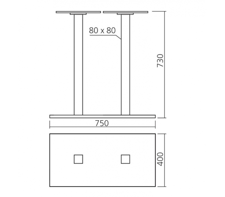 Double pied central carré fixe Base de 400 x 750 mm. Hauteur: 73cm Dimension des tubes (mm) : 80 x 80.