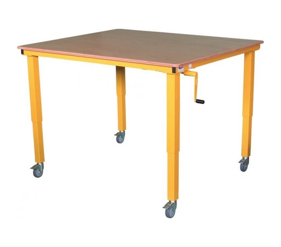 - Réglage en hauteur : De 550 à 850 mm (du sol au dessus du plateau) par manivelle amovible (dessous et à droite du plateau).